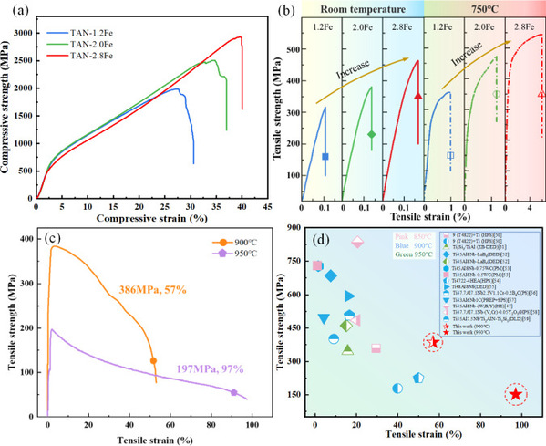 图2 力学性能:(a)TAN-xFe合金的压缩性能;(b)TAN-xFe合金在室温和750°C温度下的拉伸性能;(c)TAN-2.8Fe合金在900°C和950°C下的拉伸性能;(d)与其他TiAl合金的拉伸性能对比图。